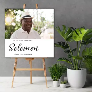 A funeral sign placed at the front of the church, synagogue, mosque, or graveside serves as a poignant and heartfelt tribute to a loved one who has passed. Positioned prominently on an easel, it features a picture of the departed, as well as their birth and passing dates, visually anchoring the service to the person being remembered. This sign acts as a focal point, helping to guide attendees emotionally as they enter the space, offering an immediate connection to the person whose life is being celebrated. In its largeformat, it not only honors the individual but also invites those in attendance to reflect on the life and legacy of their friend or family member. In a moment where words may fail, a canvas funeral sign speaks volumes, embodying love, respect, and remembrance in a profound and tangible way.