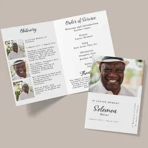 Our Funeral Programs are available in four or two page A5. The four page A5 Order of Service sits in your hand A5 size and opens like a greeting card. There is space to write on every side and RapidStudio’s order of service funeral template offers a variety of designs and layouts so there is space for all the details you want to include - be it photographs, poems, scripture, obituary and more. The A5 two page funeral order of service, sits in the hand A5 size and is double-sided. Also available in a variety of design and page layouts. Printed on 150 gram paper in full colour, these funeral programmes will help to honour your loved one at the memorial service.